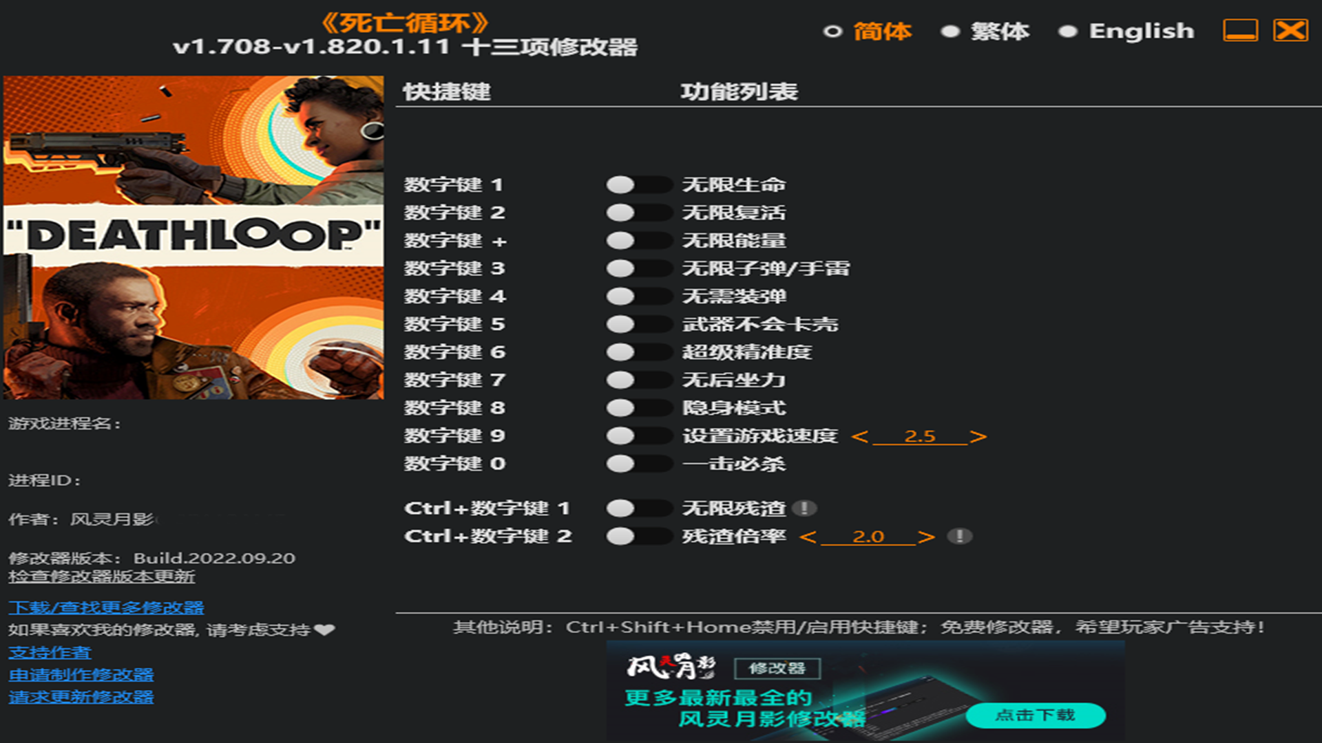 死亡循环十三项修改器为大家带来相当全面的解锁玩法。可以设置游戏的速度,达到与自己最适配的游戏节奏。获得强大的攻击力,在无限子弹手雷的基础之上,得到一击必杀的强大手段。喜欢金手指的小伙伴,点击下载感受吧。