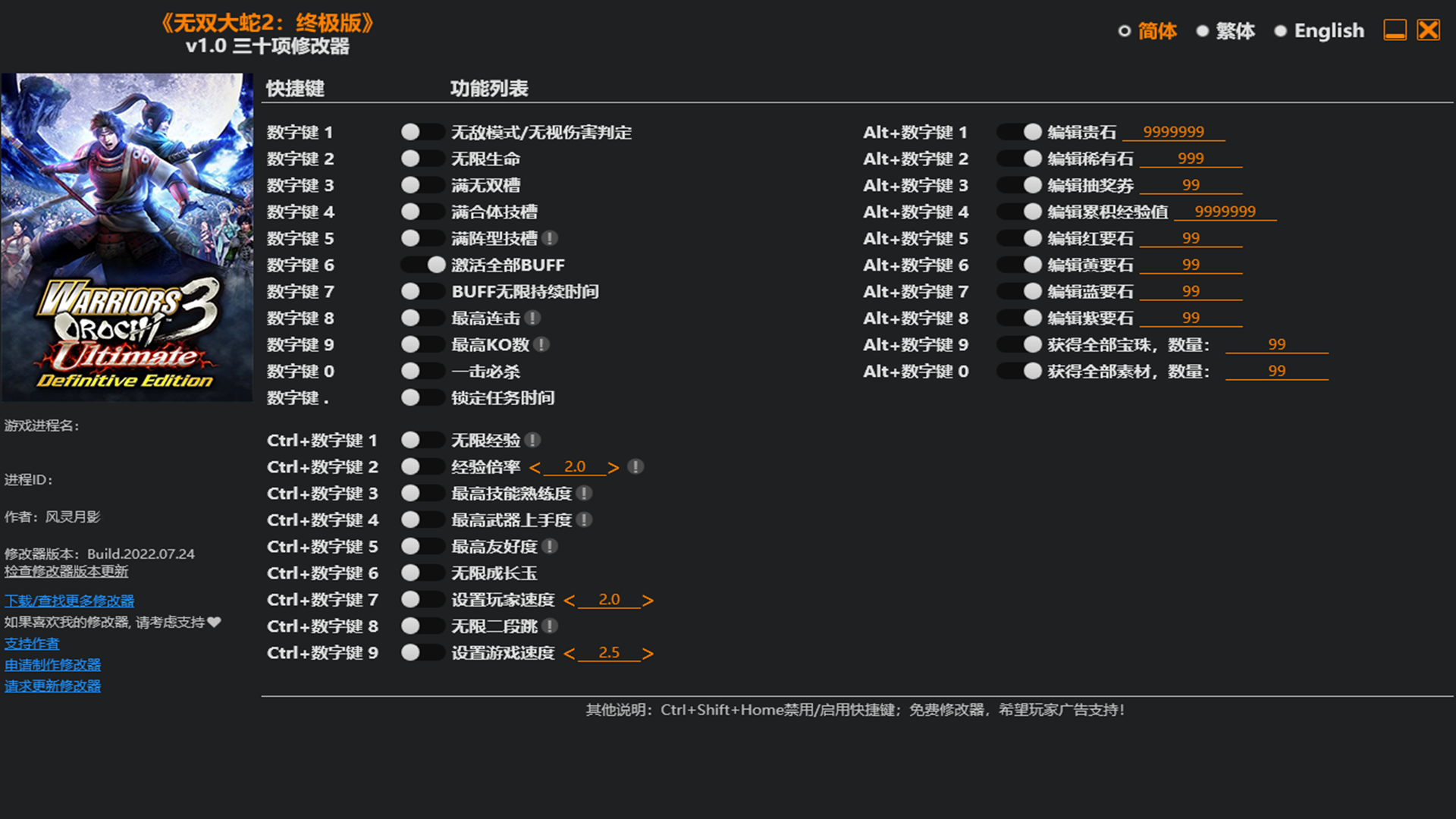 无双大蛇2终极版三十项修改器让玩家在游戏的中成长变得简单。通过修改器,更改经验的倍率,获得原本十倍百倍的经验,快速的升级。还能对贵石,稀有石,抽奖券的数量进行编辑,想要多少自己填写数据。心动的小伙伴,点击下载金手指吧。