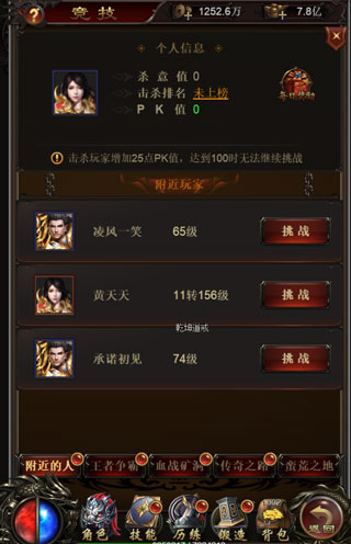 c. 竞技中胜利获得25点PK值。达到100时无法继续挑战,失败不获得奖励和PK值。