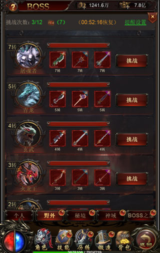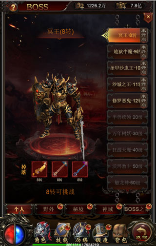 a. 玩家在个人BOSS中可以独占强大的BOSS收益,该BOSS掉落与野外BOSS掉落一致。