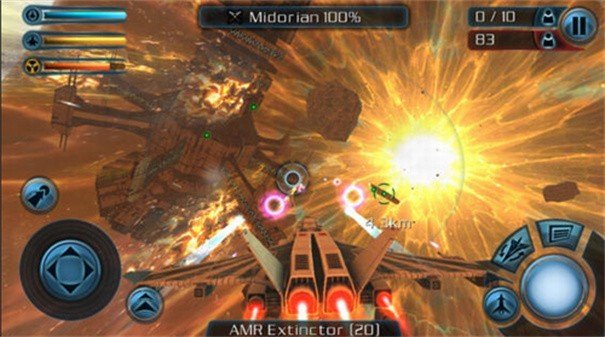 一款画面极为出色的太空飞行射击类的游戏大作,使用虚拟摇杆控制瞄准器的方向,并有多种武器按钮可使用,可玩性很强。