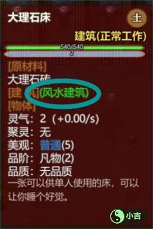 通常来讲,生活方面(像床、桌子、水缸、墓地等)、工作范畴(比如铁匠台、伐木桌等)、门派相关(例如炼丹炉、炼器炉等)以及娱乐领域(如虫鸟架、围棋桌等)里的多数蓝图都归属于风水建筑。在风水建筑的小提示上,会明确出现“风水建筑”这一标识,而且风水建筑的名称颜色也会呈现出差异。风水建筑的风水状况,会依据其所在位置的五行分布变动而产生改变。当建筑的五行属性与建筑地点的五行匹配度越高时,其风水就越好。