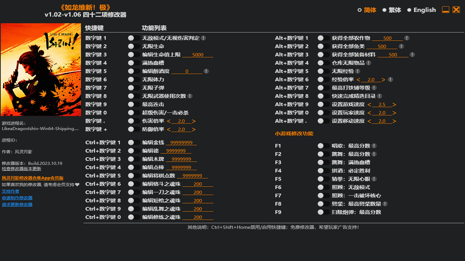 如龙维新极修改器是一款风灵月影制作的独立于游戏之外的修改器,玩家先打开游戏之后,再打开这款修改器,就能对游戏的内容进行修改。例如获得无限的体力,无限的生命等等。开启无敌模式,无视伤害判定,对敌人一击必杀。