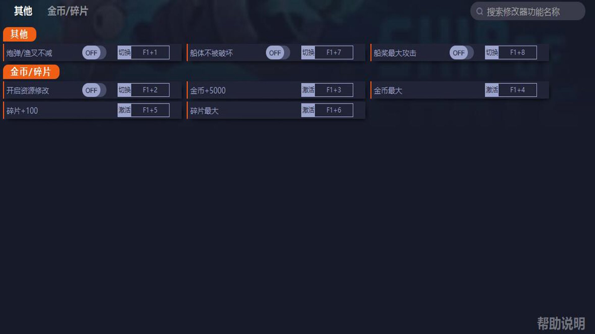2.开启资源修改:进入游戏控制角色时开启,船上大炮射击后修改,下次对应资源变动时刷新。金币为当前金币,非初始金币。