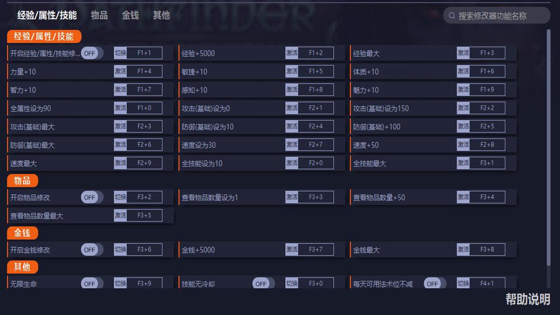 3.开启修改器各主初始项再使用各子修改项[无主初始项则不用开启][主初始项:如开启...修改]。