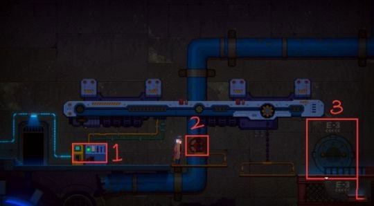 2、接通电流后,启动下图的控制台【1】,此时升降台会升起。接着转动升降台上的红色阀门【2】,让水流引出。之后可顺势进入最右侧【3】的E - 3门,获取【遗落的机器人笔记】。
