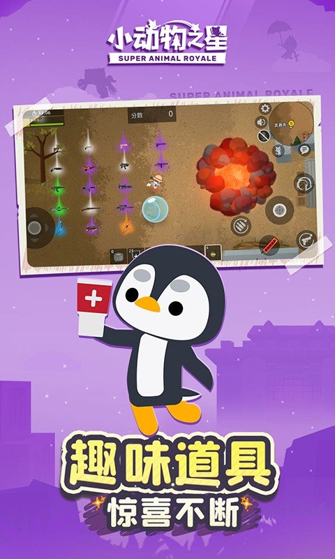 3.丰富的道具系统:游戏中有许多搞怪诙谐的道具,如香蕉皮、仓鼠球等,这些道具既能够增加游戏的趣味性,也能够为玩家的战斗和生存提供帮助。