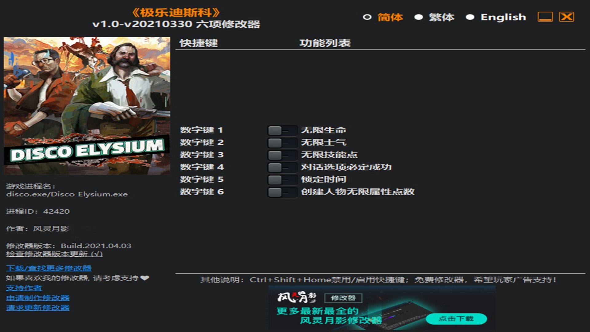 极乐迪斯科六项修改器可让玩家在游戏中,通过锁定时间、编辑技能点、属性点等功能,在游戏中化身超人。感受无与伦比的强大能力,非常有趣。整整六种功能,带给大家不一样的游戏感受。喜欢的小伙伴,点击下载感受吧。