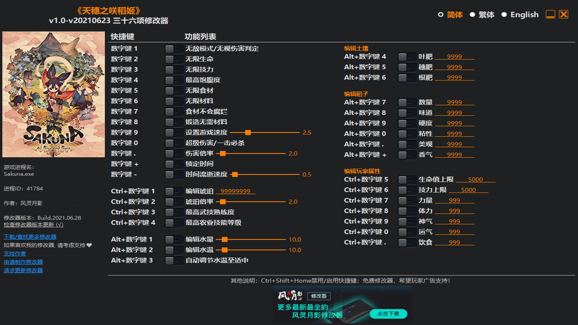 天穗之咲稻姬修改器三十六项是最好用的保险箱,让游戏中的食材不在腐烂。一键就能获得最高的饱食度,想要什么食材,材料,轻易获得。获得直接来一段无需材料的锻造。共有三十六种功能,喜欢的小伙伴,点击下载感受吧。