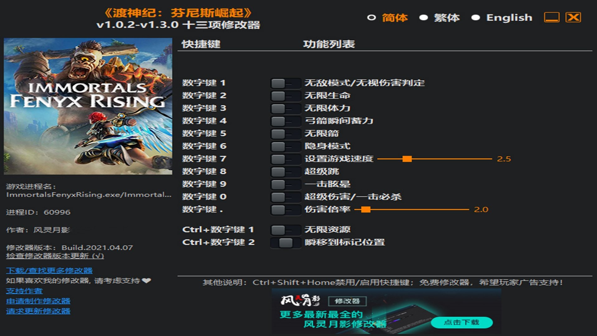 渡神纪:芬尼斯崛起修改器13项是一款风灵月影制作的辅助工具,玩家通过相应按键,就能获得提高伤害倍率,在游戏中不断的保存位置,进行瞬移的好用功能,节省大量的移动时间。喜欢的小伙伴,点击下载感受金手指吧。