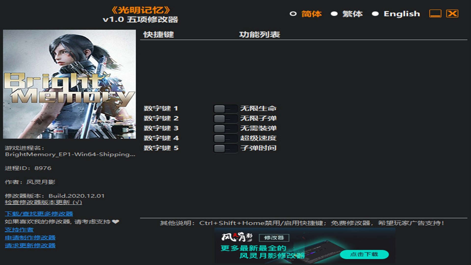 光明记忆修改器风灵月影版为玩家在游戏中感受不一样的游戏玩法,这里你可以获得无限的子弹,搭配子弹时间就能在游戏中随意的屠戮敌人。在危险的世界中随意的横行。带来最惊喜的游戏体验,喜欢的小伙伴,点击下载感受吧。