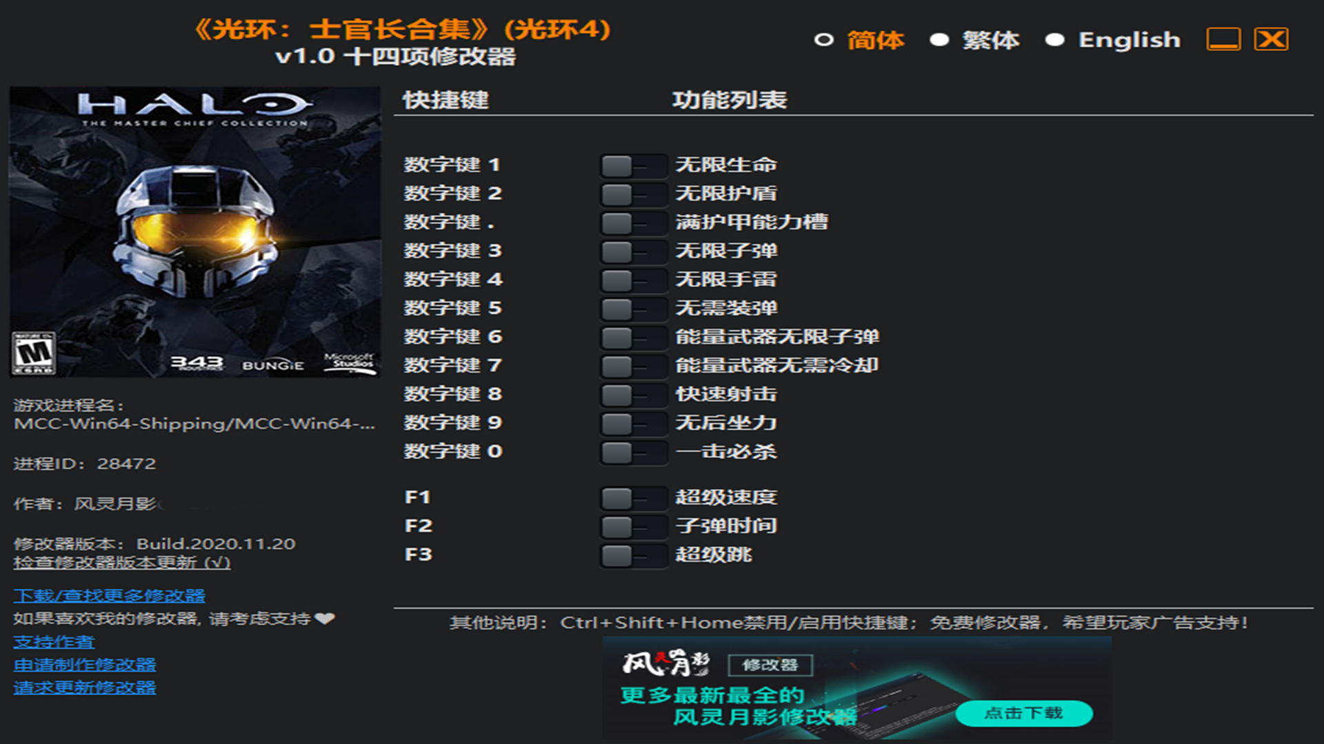 光环4修改器为玩家在游戏中带来非常强大的火力,让玩家在无限子弹和手雷的加持下。用炮火,对敌人的阵地进行洗礼。还有快速射击,一击必杀以及护盾能量不减这样的变态能力,提高击杀的效率,喜欢的小伙伴,点击下载感受吧。