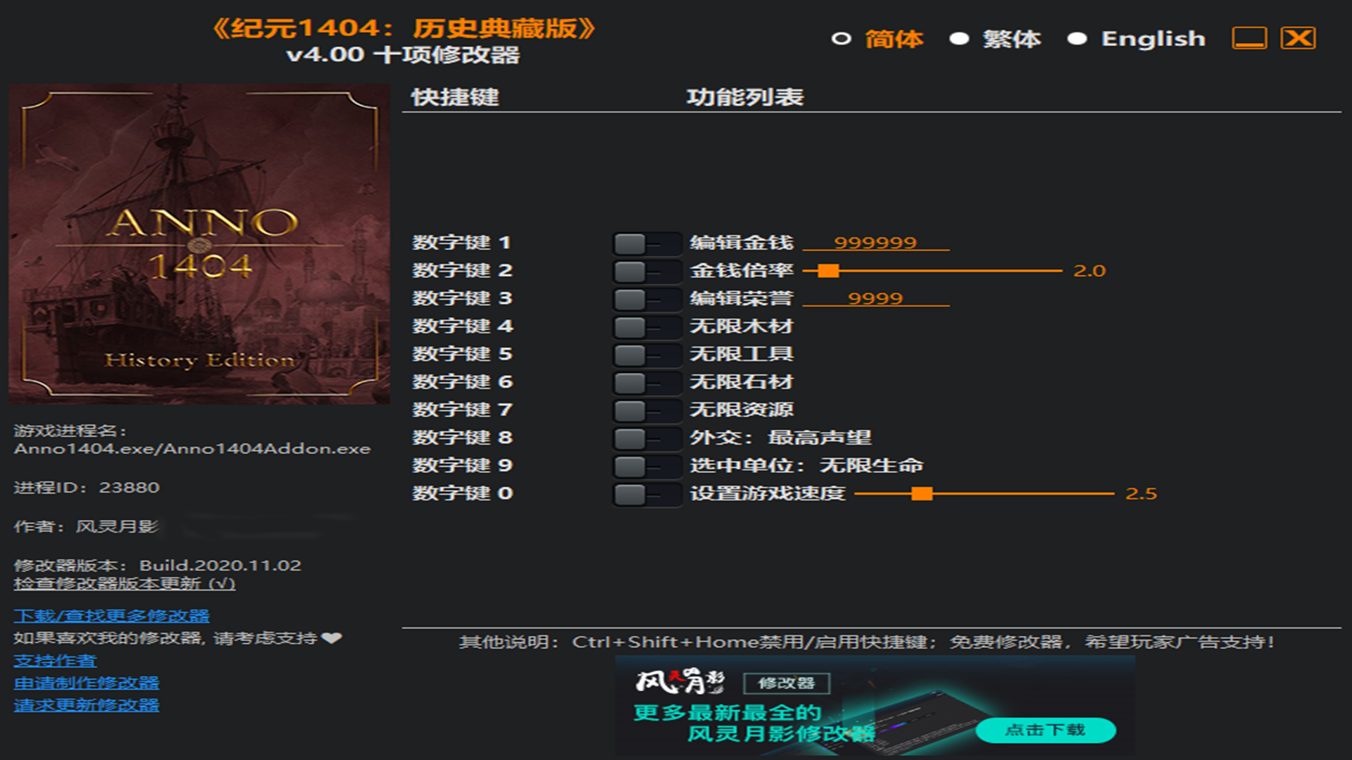 纪元1404修改器让玩家可以在游戏中尽情的建造和探索,拥有强大的经济实力,是在1404年的大航海时代安身立命的基础。通过修改器,可编辑金钱,编辑荣誉,得到无限的木材和工具,还能一键得到最高的外交声望。喜欢的小伙伴,点击下载感受吧。