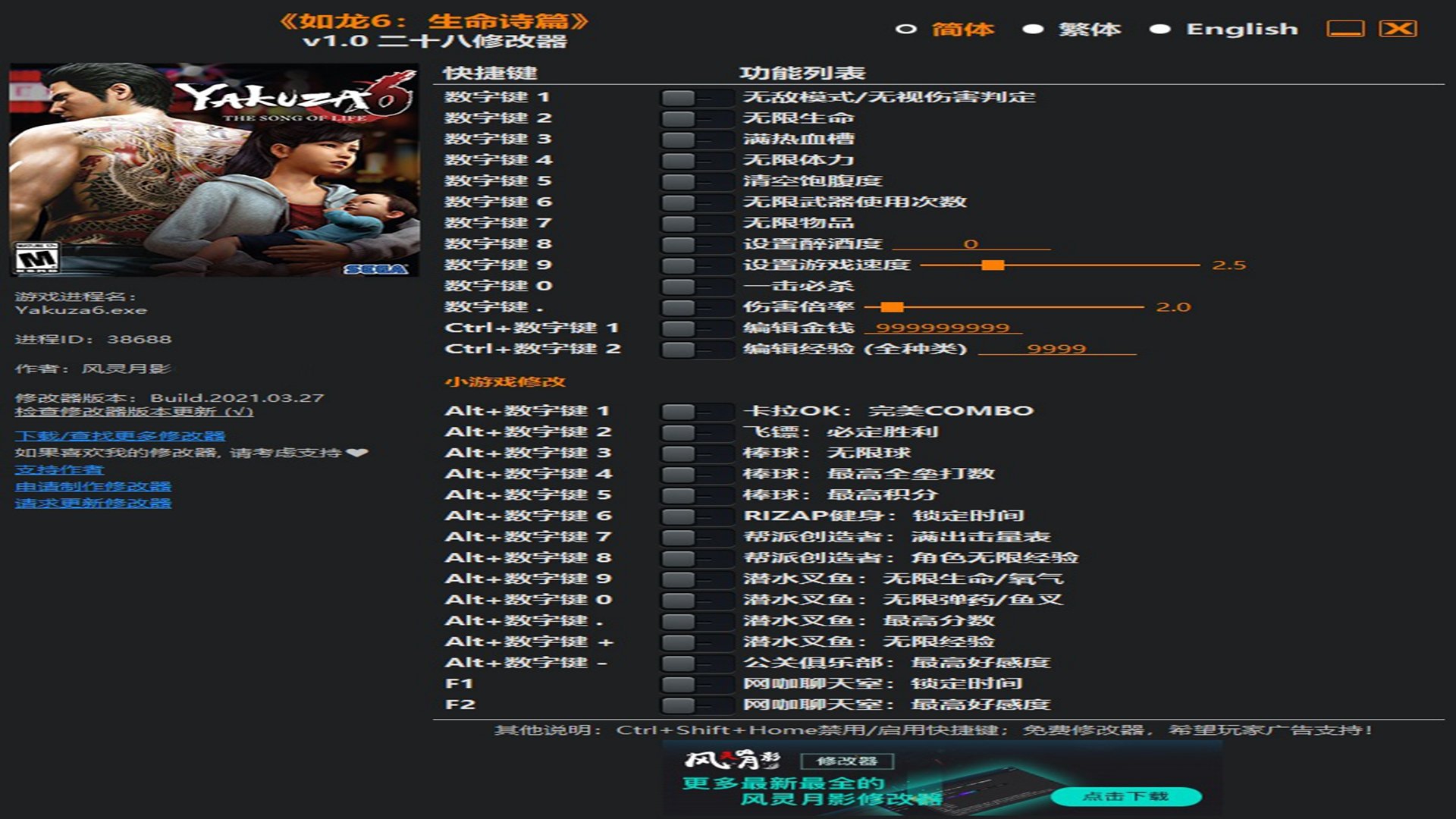 如龙6修改器二十八项拥有相当对样的修改功能,可以在这里化身为战神,进入无敌模式。在修改器的加持下,可以设置醉酒度,设置游戏速度,还能编辑金钱,编辑全种类的经验。喜欢的小伙伴,点击下载感受金手指的魅力吧。