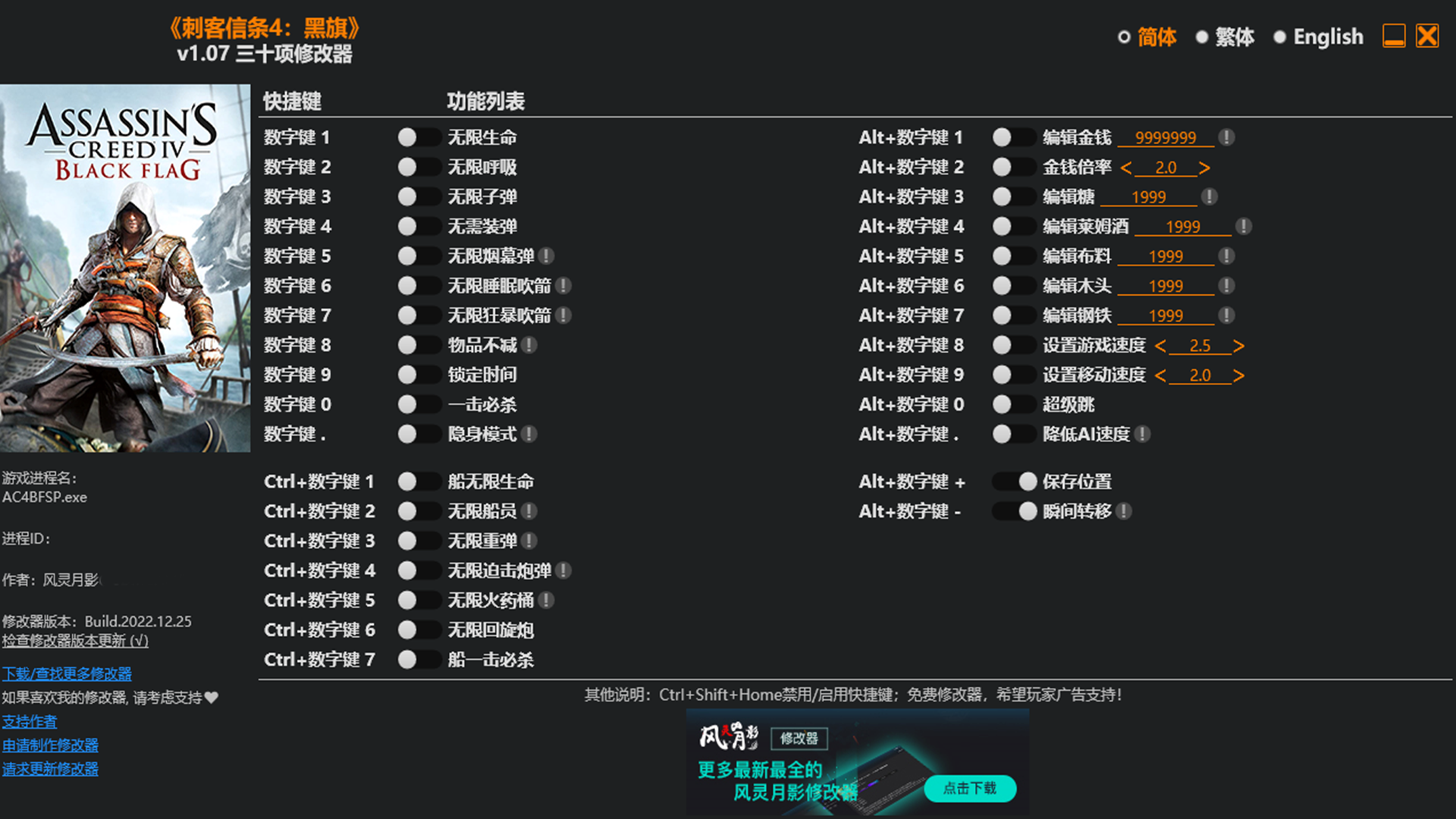 刺客信条4黑旗三十项修改器可以编辑金钱,编辑船体和人物本身的生命值的修改。还能让玩家在航行中不会缺少任何的物品。得到编辑钢铁,编辑布标,编辑糖等功能。非常强大的功能等你感受,喜欢的小伙伴,点击下载感受吧。
