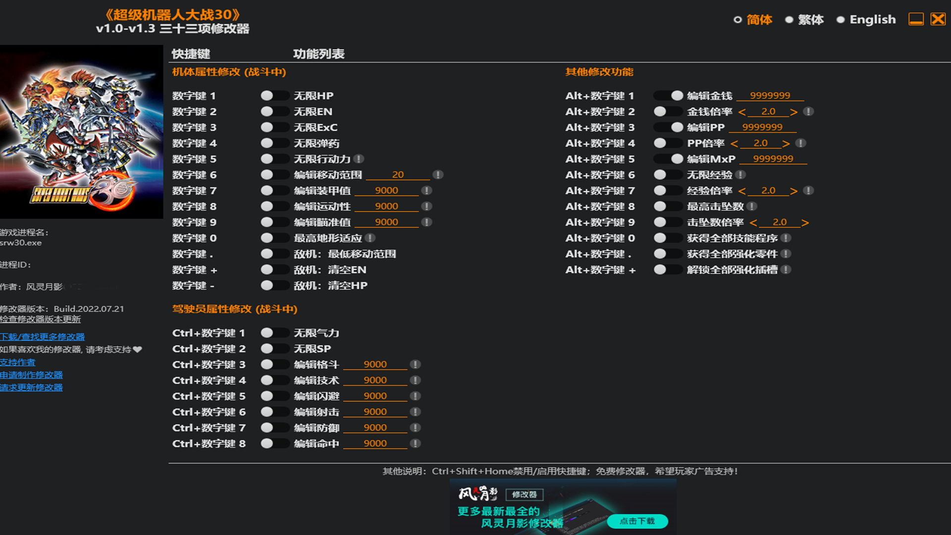 超级机器人大战30修改器电脑版为玩家提供整整三十三种功能。针对战斗,角色状态,敌人的状态进行无限制的修改。获得大量的经验,金钱,各种数值。在游戏中化身为六边形展示,为所欲为。喜欢的小伙伴,点击下载感受吧。