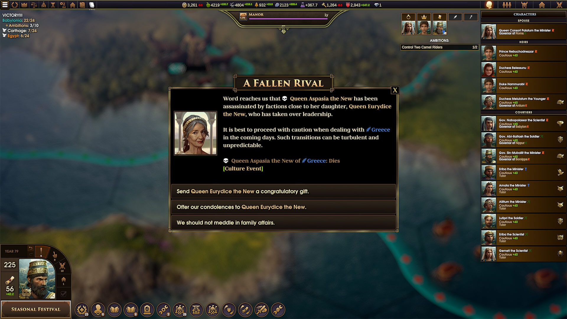 你的王朝将透过完成 10 项抱负取得胜利,每项抱负将会越来越困难。抱负将会依据你的游戏事件与角色欲望动态生成。每一盘游戏都是独一无二的,而有智慧的统治者会知道何时该改变方针。
