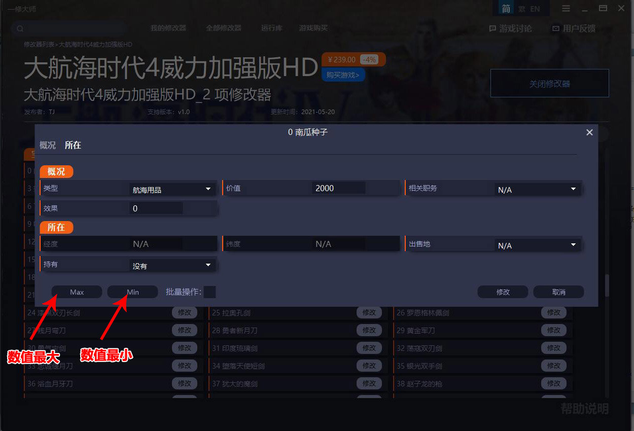 3.点击修改按钮就可以修改海员及宝物的对应面板。点击下方的【Max】、【Min】按钮可以一次性将所有能力提到最大或降到最小。