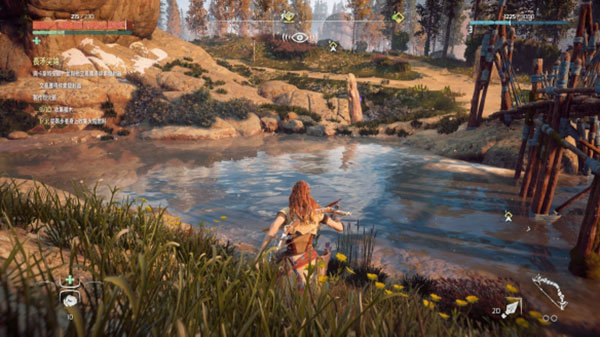 2、攀爬系统:游戏内的攀爬点一般多由黄色、橙色、白色标记,在进行攀爬时一般只需要推动左摇杆对应方向,亚萝伊便可以自动攀爬,一些相离较远的攀爬点时再按X来跳跃。