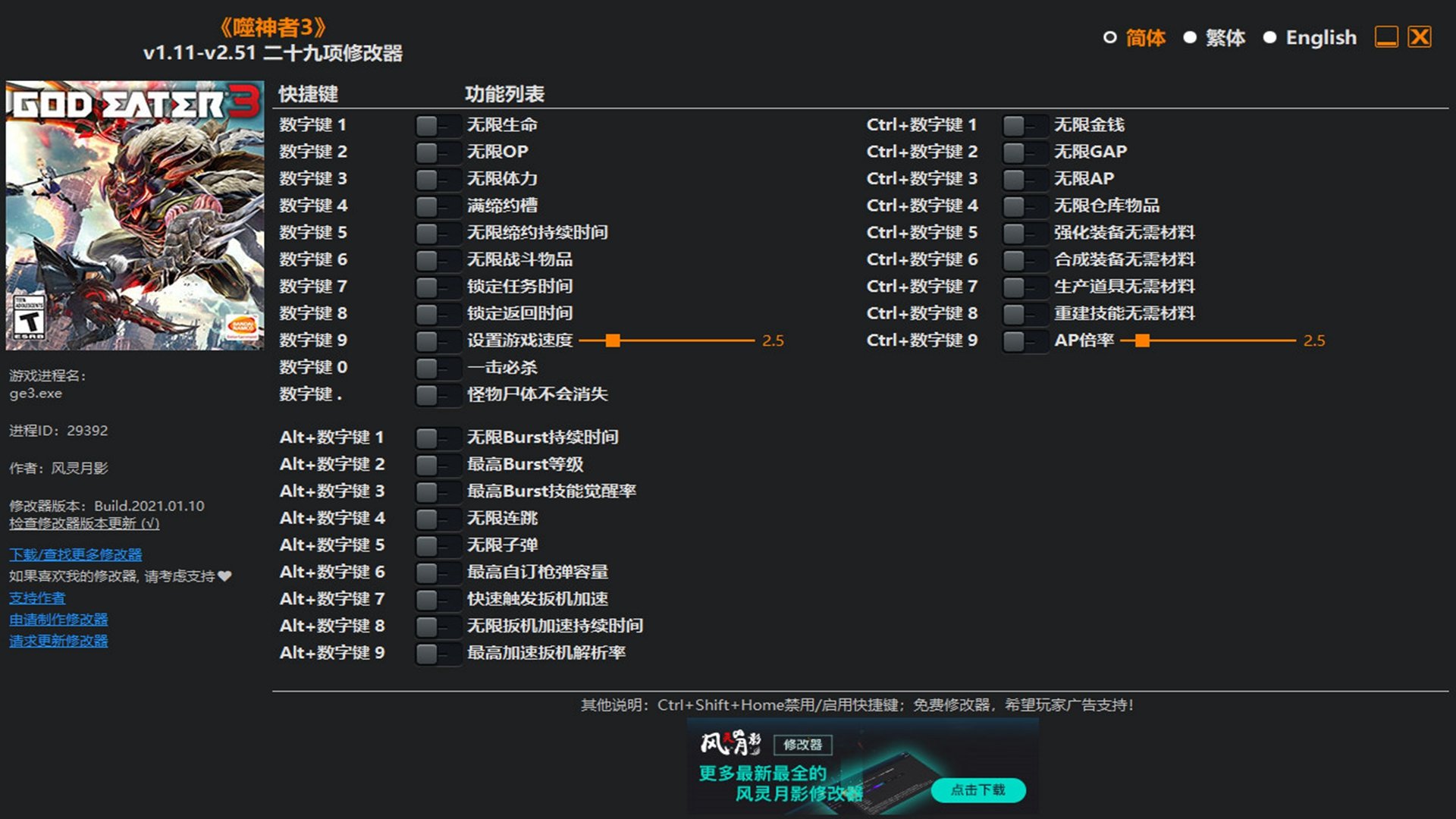 噬神者3修改器中文版是一款同名动作游戏噬神者3的游戏辅助修改工具,可以帮助玩家自定义角色属性、解锁隐藏道具和增强战斗技能等。十种修改功能,针对各种参数,让玩家化身为顶级的科技战士,横行无忌,喜欢的小伙伴,点击下载吧。