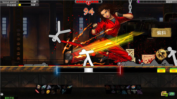 1、和一代一样,游戏核心机制非常简单,整个游戏只用一个鼠标就可以游玩:敌人从左边进入攻击范围时按左键,从右边接近的时候按右键,玩家操纵的火柴人就会自动攻击敌人,按得过早或是过晚都会收到惩罚。