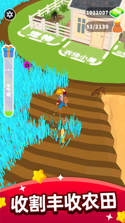 《收割大师》是一款超解压的模拟休闲手游,灵感源自庄稼收割场景。在游戏里,玩家得赶紧收割成熟的庄稼,为下一季种植做准备。只需滑动屏幕就能操控角色移动,前往农场区域,角色会自动挥动镰刀收割农作物。把收集好的农作物拿到市场上买卖,就能换取金钱。有了充裕资金,就可以扩建农场、升级装备,从而提高收割效率。而且,除了这些玩法,玩家还能养育宠物,再配上割草般的爽快体验,能带来更多惊喜乐趣!