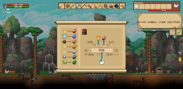 装备分为了头盔、护甲、鞋子、饰品(项链、戒指及额外附属品)、翅膀,这些都可以在物品栏左侧的装备栏中给角色装配。目前可以制作的装备有头盔、护甲、鞋子,你需要准备好砧以及所需的材料(多为金属条,金属条需要用金属矿物来合成)。