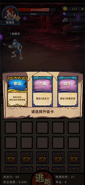 角色升级后会随机给出三张卡片,需要玩家三选一,提升属性。
