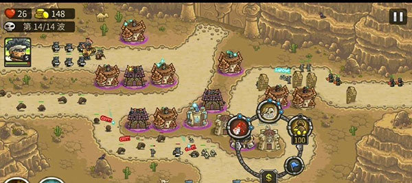 3、成功度过前期后,中期我们优先升级两侧的法师塔,注意第7波怪物之后,右侧会出现潜地的沙虫,所以一定要再建1个兵营并把集结点设在上方。配合兵营左侧的自动平台便能对脆皮的沙虫造成毁灭性的伤害。