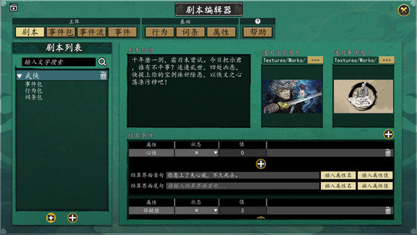 故事编辑器支持:自定义属性、自定义词条、自定义行为、自定义事件、事件流-事件包-剧本;丰富的本地图片库、自定义图片/GIF动图导入。据多数使用者分析,当前编辑器基本可以做出大部分人喜欢的剧本。