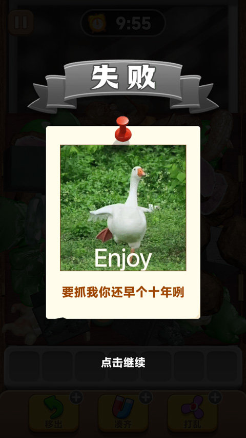 5、如果在规定时间没有成功消除所有物品,抓到大鹅则游戏失败;