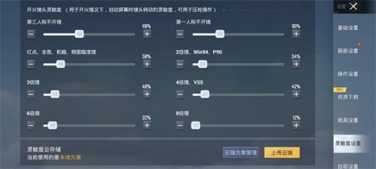 5、开火陀螺仪灵敏度:第三人称不开镜:100%;第一人称不开镜:100%;红点、全息、机瞄、侧面瞄准镜:50%;2倍镜、win94、p90:30%;3倍镜:21%;4倍镜、vss:14%;6倍镜:11%;8倍镜:10%。