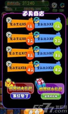 2014 巴西世界杯盛大开启!世界杯就如同一场全民的节日,不管你是不是足球爱好者,都能够去体验这个每四年才举办一次的节日所洋溢出的欢快氛围。在游戏里,只要把 3 件属于同一球队的球衣拼接在一起,就能实现消除哦!