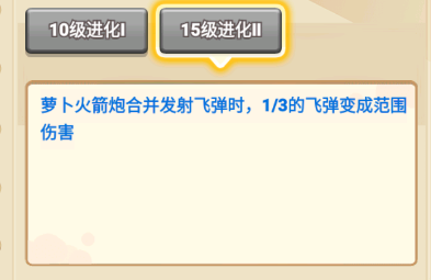 当萝卜火箭炮达到15级即可进行二阶进化,进化后技能效果为“萝卜火箭炮合并发射飞弹时,1/3的飞弹变成范围伤害”。