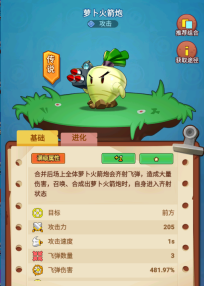 萝卜火箭炮基础技能为“合并后场上全体萝卜火箭炮会齐射飞弹,造成大量伤害,召唤、合成出萝卜火箭炮时,自身进入齐射状态”。