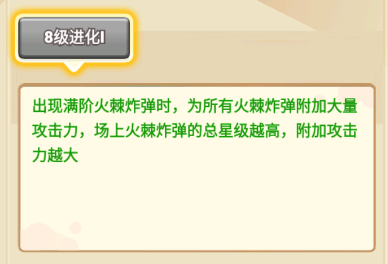 火棘炸弹的基础技能是“对小范围僵尸造成同等火焰爆炸伤害”。当其等级达到8级,便可进化。进化后的技能效果变为“出现满阶火棘炸弹时,为所有火棘炸弹附加大量攻击力,且场上火棘炸弹的总星级越高,所附加的攻击力越大”。