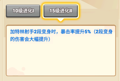 当加特林射手达到15级即可进行二阶进化,进化后技能效果为“加特林射手2段变身时,暴击率提升5%,同时伤害也会大幅提升”。