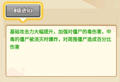 毒蘑菇的基础技能是“每秒喷发的毒雾,可对僵尸造成持续性的剧毒伤害,且剧毒效果无法叠加”。当其等级达到8级,便能够进化,进化后的技能效果变为“基础攻击力显著提升,对僵尸的毒伤害进一步加强,中毒僵尸被消灭时会爆炸,对周边僵尸造成百分比伤害”。
