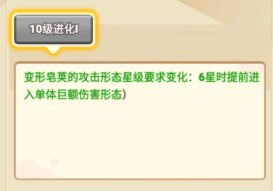 变形皂荚的基础技能是“依据植物星级转变为攻击形态”,当其等级达到10级便能够进化。进化后的技能效果为“变形皂荚攻击形态的星级要求产生变化:植物为6星时,可提前进入单体造成巨额伤害的形态” 。