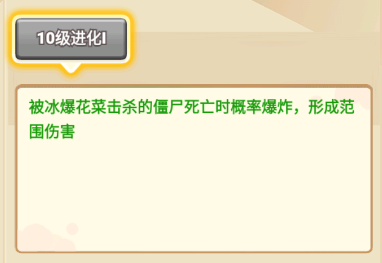 冰爆花菜基础技能为“攻击减速目标时形成多倍伤害”,当达到10级即可进行进化,进化后技能效果为“被冰爆花菜击杀的僵尸死亡时概率爆炸,形成范围伤害”。
