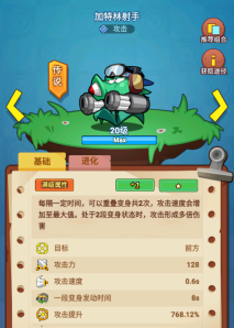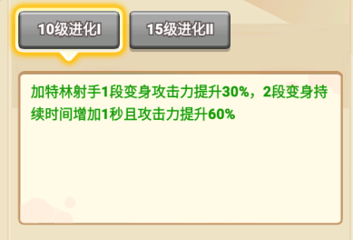 当加特林射手达到10级即可进行一阶进化,进化后技能效果为“加特林射手1段变身攻击力提升30%,2段变身持续时间增加1秒且攻击力提升60%”。
