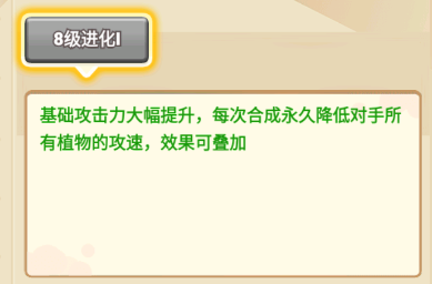 龙草射手基础技能为“超快攻击速度”,当达到8级即可进行进化,进化后技能效果为“基础攻击力大幅提升,每次合成永久降低对手所有植物的攻速,效果可叠加”。