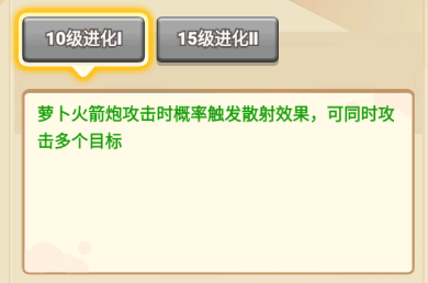 当萝卜火箭炮达到10级即可进行一阶进化,进化后技能效果为“萝卜火箭炮攻击时概率触发散射效果,可同时攻击多个目标”。