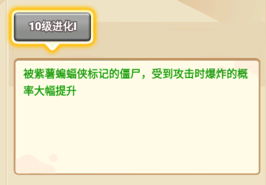 紫薯蝙蝠侠的基础技能是,攻击时会标记丧尸,被标记的丧尸在受到攻击时有一定概率爆炸,进而造成范围伤害,而且自身星级越高,爆炸伤害就越高。当其等级达到10级时,便可进行进化。进化之后,技能效果变为,被紫薯蝙蝠侠标记的丧尸,受到攻击时爆炸的概率会得到大幅提升。