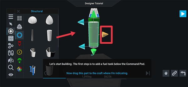3. 进入之后,按照提示,在指挥舱的下方增添一个燃料箱。点击加号按键,从“structural”类别里挑选合适的部件。
