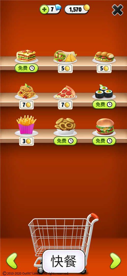 我们能在图中看到不同的食物有不同的购买方式。图中披萨要用7个金币买。金币一般可以在小游戏中获取一点,还有每次升级也可以获取到几百个。