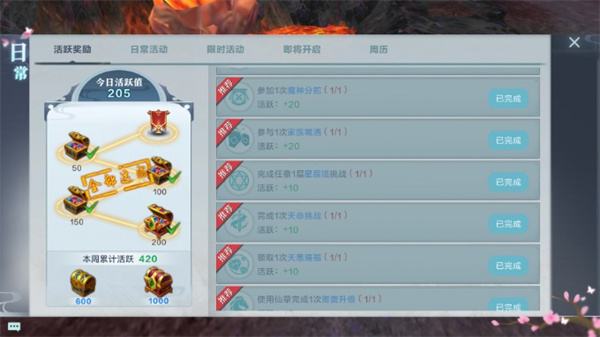 每当完成一项日常任务,玩家都会获取相应的活跃值。当每日活跃度分别累计至50、100、150以及200时,玩家便可领取对应等级的活跃值宝箱奖励。此外,每周还设有周活跃值,一旦周活跃值达到500和1000,玩家就能收获极为丰厚的宝箱奖励。