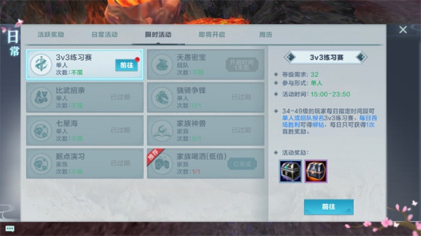 限时活动就是每天不同时间段限时开放的活动,有着更高的奖励收益。3v3练习场每次都会有两队天命者进行对抗,每队各有3名不同职业的天命者。每日首次获胜可以得到丰厚的奖励。