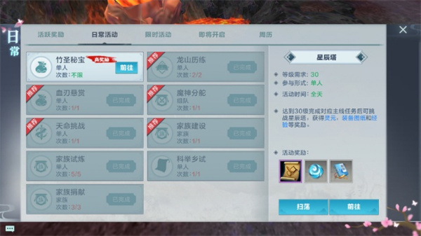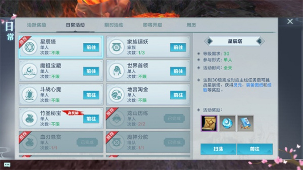 日常活动指的是玩家每天都必定要参与的一系列活动,涵盖星辰塔、家族镇妖、魔祖宝藏、世界首领、斗战心魔、地宫淘金、竹圣秘宝、龙山历练、血刃悬赏、魔神分舵、天命挑战、家族建设、家族试炼、科举考试以及家族捐献等。这些任务能够划分成几个不同的大类。