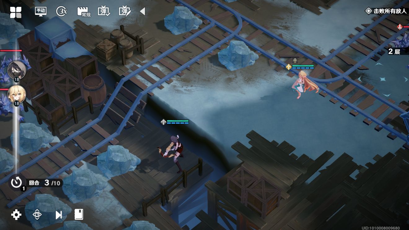 最后用射手把上方的石头射掉。看到我所指的那个发光空格了吗?需要在那里积攒五个体力才行。射掉石头后,马上跑到对面轨道处,卡住一个先锋,不能让两个先锋同时攻击到自己。接着,将后面的两个体力移动到我所在位置,卡住另一个先锋,这样到最后一个回合就能过关。